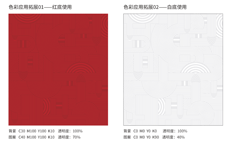 輔助圖形可在兩種底色上運(yùn)用,即輔助色紅色底與白色底上使用。當(dāng)在輔助色紅色底上使用時,輔助圖形色彩為標(biāo)準(zhǔn)色紅色并將透明度降低至70%;當(dāng)在白色底上使用時,輔助圖形色彩K90的灰色,透明度降低至10%。