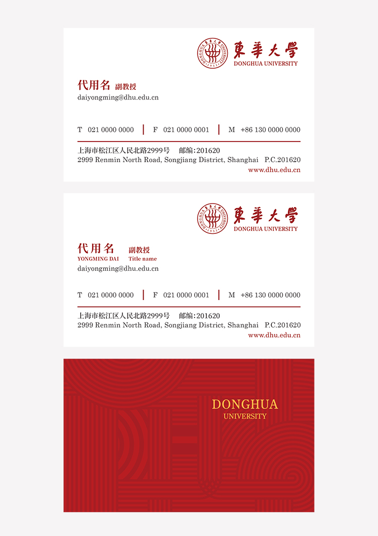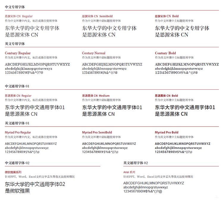 東華大學(xué)VI體系的專用字體中文選用思源宋體CN系列,英文選用Century系列,適用于內(nèi)部辦公、傳播物料、宣傳資料、廣告宣傳品、印刷文件等。