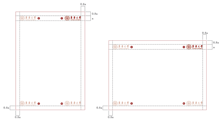 我們在版面中具體定義了標(biāo)識與版面邊緣的距離,即以校徽的高度為一個單位a,其所在畫面中的位置與版面邊緣的距離不能小于0.8a,請嚴(yán)格按照規(guī)范使用制作。