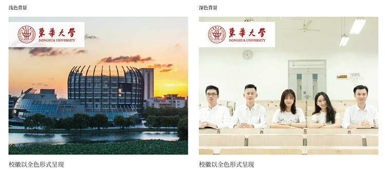 校徽在圖片中使用時分為兩種情況——淺色背景與深色背景。當(dāng)標(biāo)志在淺色背景與深色背景上使用時,為保證標(biāo)志的識別度,請如右側(cè)所示,將標(biāo)志放置透明度為90%的白色品牌框中使用。
