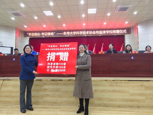 培訓前舉行了簡短的捐贈儀式,謝旭紅代表我校向鹽津中小學捐贈圖書、教具,包括科普讀物100套、新華字典100本以及計算器100件,鹽津青少年活動中心負責人代表鹽津縣教體局接受捐贈。