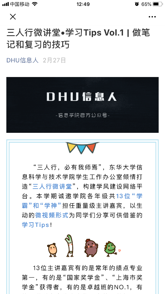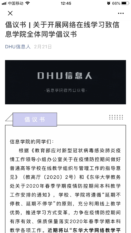 (DHU信息人微信公眾號(hào)發(fā)布網(wǎng)絡(luò)在線學(xué)習(xí)倡議書和微信群二維碼)
