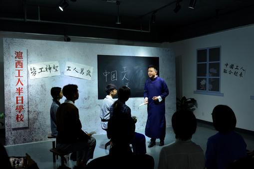 活動現場,來自全國高校“百個研究生樣板黨支部”——人文學院“學思先鋒”碩士生黨支部的學生黨員,用情景演繹的形式再現中國共產黨早期組織創辦的第一所工人學校授課場景。“誰說‘工字不出頭,出頭便入土’?‘工’‘人’上下連在一起,就是個‘天’字,咱們工人可是頂天立地的!”黨史學習與校史學習緊密結合,讓黨員干部和師生學出自己的特色和東華味道。展覽動靜結合,觀眾不僅可以靜態學習參觀文物史料圖片,還能在動態的情景演繹中深刻感受紅色紡織中的革命力量。