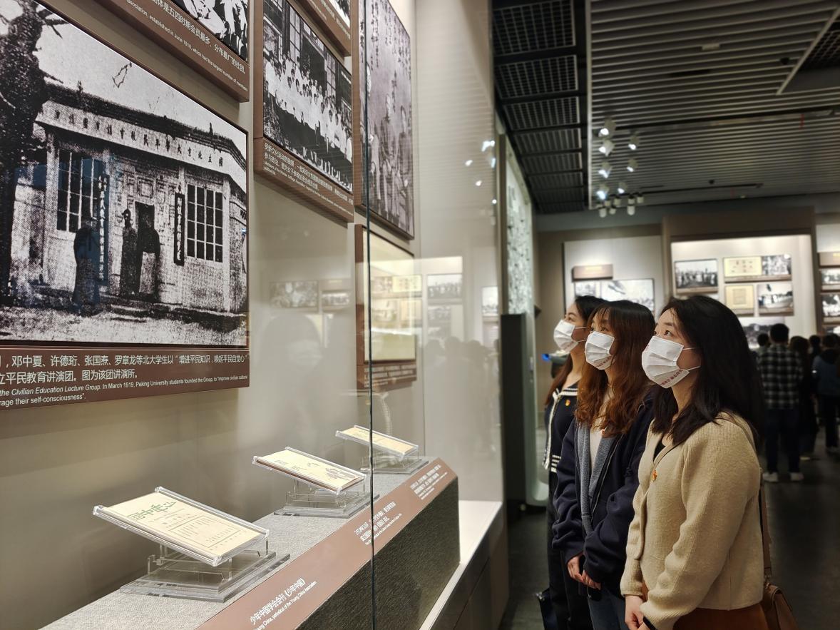 董必武曾為中共一大會址題詞:“作始也簡,將畢也鉅”,這精準地描繪出中共一大會議的情況,當初13位代表出席會議,全國也才50多名黨員,如今百年過去,中國共產黨持續煥發出勃勃生機。在這座中國共產黨的“產房”、共產黨人的精神家園中,師生黨員一行共同參觀了“偉大的開端——中國共產黨創建歷史陳列”展覽。面對一件件飽經滄桑的珍貴史料、一張張定格歷史的資料照片,大家不時停下腳步,上前仔細端詳,了解建黨文物所蘊含的歷史意義,尤其在中共一大代表群像浮雕前,對著浮雕列數中共一大十三名代表的姓名,感嘆英雄輩出,也感嘆大浪淘沙。全體成員深刻領會館中豐富的革命精神、優良的革命傳統和厚重的歷史文化內涵,并立志要繼承先輩遺志,傳承紅色基因,用實實在在的行動開新局、譜新篇。