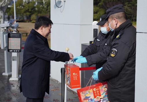 俞建勇一行赴松江校區慰問留校學生和教職員工,為值班保安、宿舍管理人員以及留校學生發放愛心大禮包,送上來自學校的關心和慰問。他先后來到校門口、學生公寓、食堂等地,與廣大教職工進行親切交談,詳細詢問假期值班情況,并向為留校學生學習生活提供保障和服務的工作人員致以新春的美好祝福。他勉勵留校學生利用好假期時間,不斷充實提高自己,同時要做好疫情防控常態化下的個人防護,合理安排作息時間,積極鍛煉身體,以飽滿的精神狀態迎接新學期。