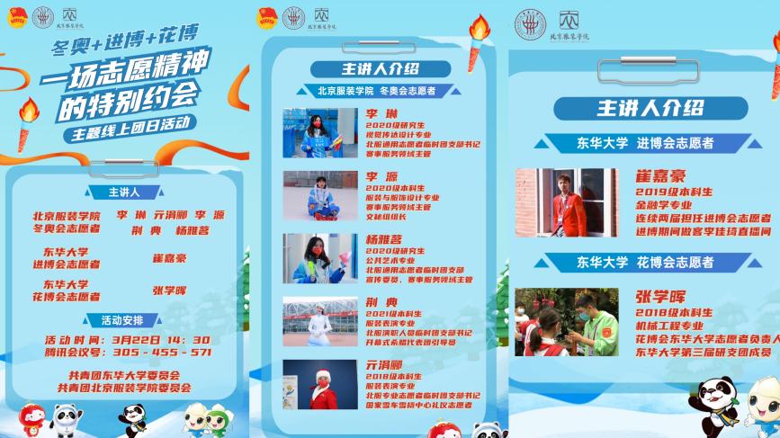 3月22日,我校團委聯(lián)合北京服裝學(xué)院團委開展“一場志愿精神的特別約會”線上主題團日活動。多位來自冬奧會、進博會、花博會的青年志愿者相聚交流,700余名團員青年線上參加,京滬兩地團員青年“云連線”,暢談志愿服務(wù)的點滴感動與團員青年的責(zé)任擔(dān)當(dāng)。