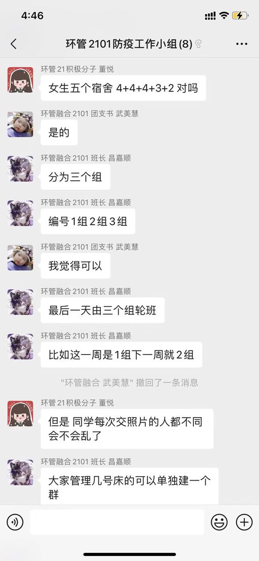 疫情面前沒有人可以置身事外,唯有各司其職、各盡其力,才能打贏這場防疫狙擊戰。支部黨員解紫茹作為專職輔導員,將中心工作與支部黨建工作結合,根據在校學生實際情況,科學合理分工,成立防疫工作小組,形成輔導員-班級骨干-入黨積極分子三個層面的疫情防控排查體系,高效完成學生的核酸檢測通知、提醒、匯總、收取截圖等相關工作,進一步提高入黨積極分子的政治站位,深化思想認識,強化責任擔當,扎實做好黨員日常培養與教育工作。