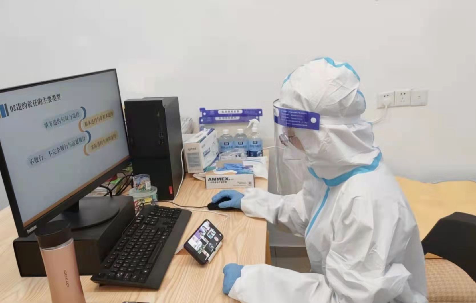 這些天,送飯大軍突然“減員”了一位干將,原來她早已轉(zhuǎn)戰(zhàn)“前線”,人文學(xué)院的高偉老師主動(dòng)報(bào)名擔(dān)任了延安路校區(qū)15宿的駐樓志愿者?!跋氲酵瑢W(xué)們那一張張信任你、依靠你,又略帶羞澀和緊張的稚嫩面孔,換做是任何一位老師都會(huì)報(bào)名參加的。”她一進(jìn)入宿舍樓,就馬上變身“大白”,投入到駐樓志愿服務(wù)……與此同時(shí),她還要化身“主播”,為學(xué)生們線下備課、網(wǎng)上授課連軸轉(zhuǎn),電腦前的高偉看不出一絲倦意,正繪聲繪色給同學(xué)們講解著“合同法”課程案例。
