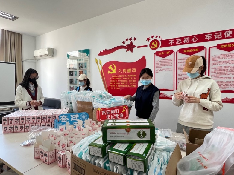 (志愿者為學生分發(fā)物資-抗疫盲盒)