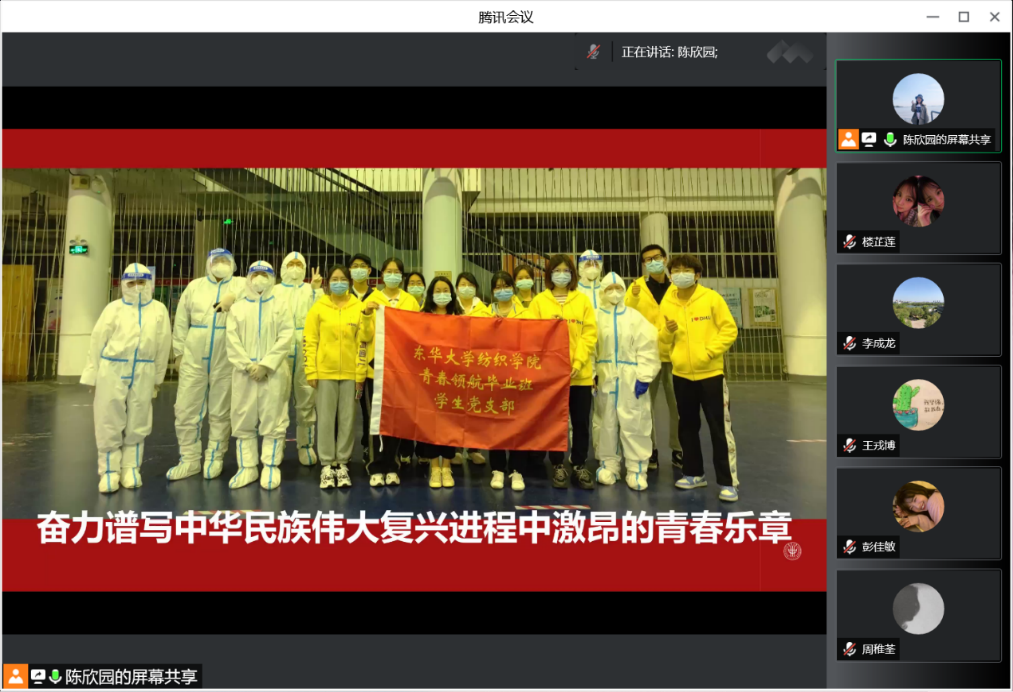 為深入學(xué)習(xí)貫徹習(xí)近平總書記在慶祝中國(guó)共產(chǎn)主義青年團(tuán)成立100周年大會(huì)上的重要講話精神,近日,紡織學(xué)院青春領(lǐng)航畢業(yè)班學(xué)生黨支部通過線上會(huì)議的形式開展“青春心向黨百年再啟航”主題黨日活動(dòng)。副校長(zhǎng)舒慧生出席活動(dòng),學(xué)院黨委書記李成龍、院長(zhǎng)顧伯洪以及黨支部全體黨員參加活動(dòng)。活動(dòng)由黨支部書記陳欣園主持。