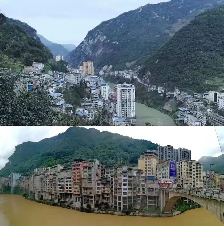 (學校幫助鹽津縣廟壩鎮黃草社區集鎮及海子村民組改善人居生活環境前后對比)