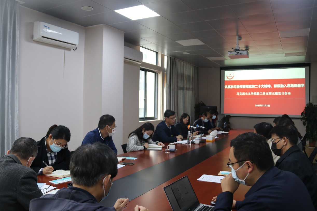 活動中,馬克思主義學院黨政班子成員就落實學校黨委關于學習宣傳貫徹黨的二十大精神部署任務,認真組織開展好學習研討,做好理論研究闡釋和宣講,及時根據課程教學任務目標和大綱,將黨的二十大精神融入思政課教學的具體舉措進行了交流。各教研室骨干和教師代表就黨的二十大精神有機融入各門思政課進行交流,提出要引導學生讀原文、悟原理,“全貌式”把握黨的二十大精神。大家表示要進一步增強宣講黨的二十大精神的使命與責任意識,“帶著感情去講”,切實將黨的二十大精神貫徹落實到思政課教學全過程。