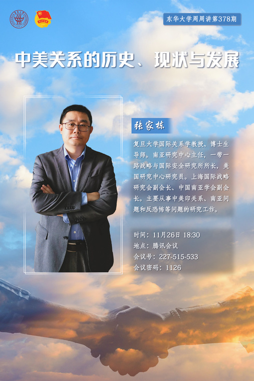 主講人簡介:張家棟,復旦大學國際關系學教授、博士生導師,南亞研究中心主任,一帶一路及全球治理研究院戰略與國際安全研究所所長,美國研究中心研究員。主要從事中美印關系、南亞問題和反恐怖等問題的研究工作。在中央電視臺、鳳凰衛視、東方衛視、解放日報等媒體發表數百篇時事評論。