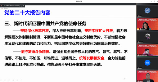 環境工程系黨支部黨員、學院副院長李方老師以“科教興國,自立自強”為主題,帶領支部全體黨員學習了二十大報告中關于實施科教興國、人才強國戰略的關鍵論述,并立足學院學科特色,提出未來教學研究方向的建議;環境工程系黨支部黨員、學院副院長劉亞男老師以“從進化論角度深入學習黨的二十大報告”為題,以進化論為類比,生動形象地向支部全體黨員教師回顧了我國開辟馬克思主義中國化的歷史進程,從路徑依賴、生物多樣化、馬太效應等新的視角提出我校專業發展特色化、多樣化、可持續發展及風險挑戰的思考與建議,并提出教師能力全面發展的重要性。