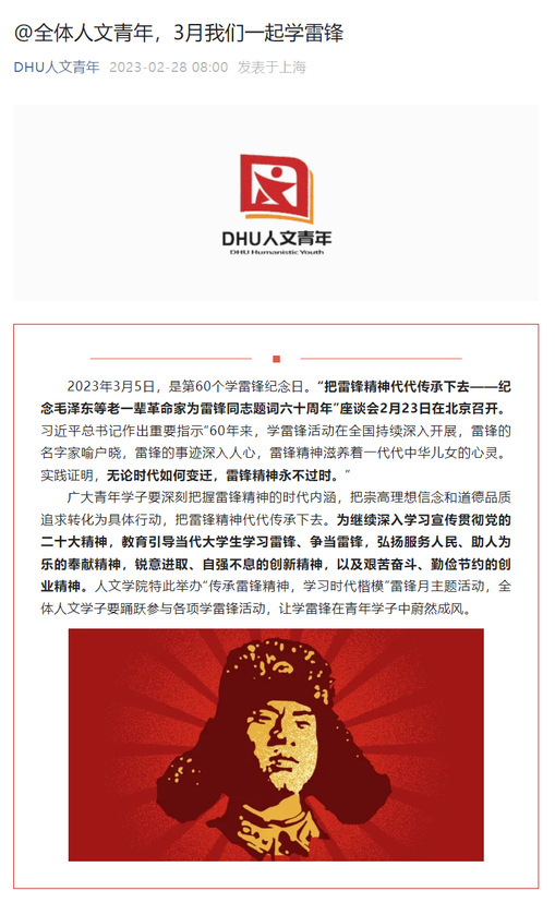 為學習貫徹習近平總書記對深入開展學雷鋒活動作出的重要指示精神,人文學院組織學院各黨員組織、青年學子深入開展“傳承雷鋒精神,學習時代楷模”雷鋒月主題學習實踐活動,引導學生通過主題黨日、團日和特色志愿活動,深刻學習領會雷鋒精神的時代內涵和實踐要求,整合資源發布各類志愿服務活動信息,鼓勵全體人文學子踴躍參與各項學雷鋒活動,深入社區、場館等,以志愿服務實際行動書寫新時代雷鋒故事,全力推動“學雷鋒”在青年大學生中蔚然成風。