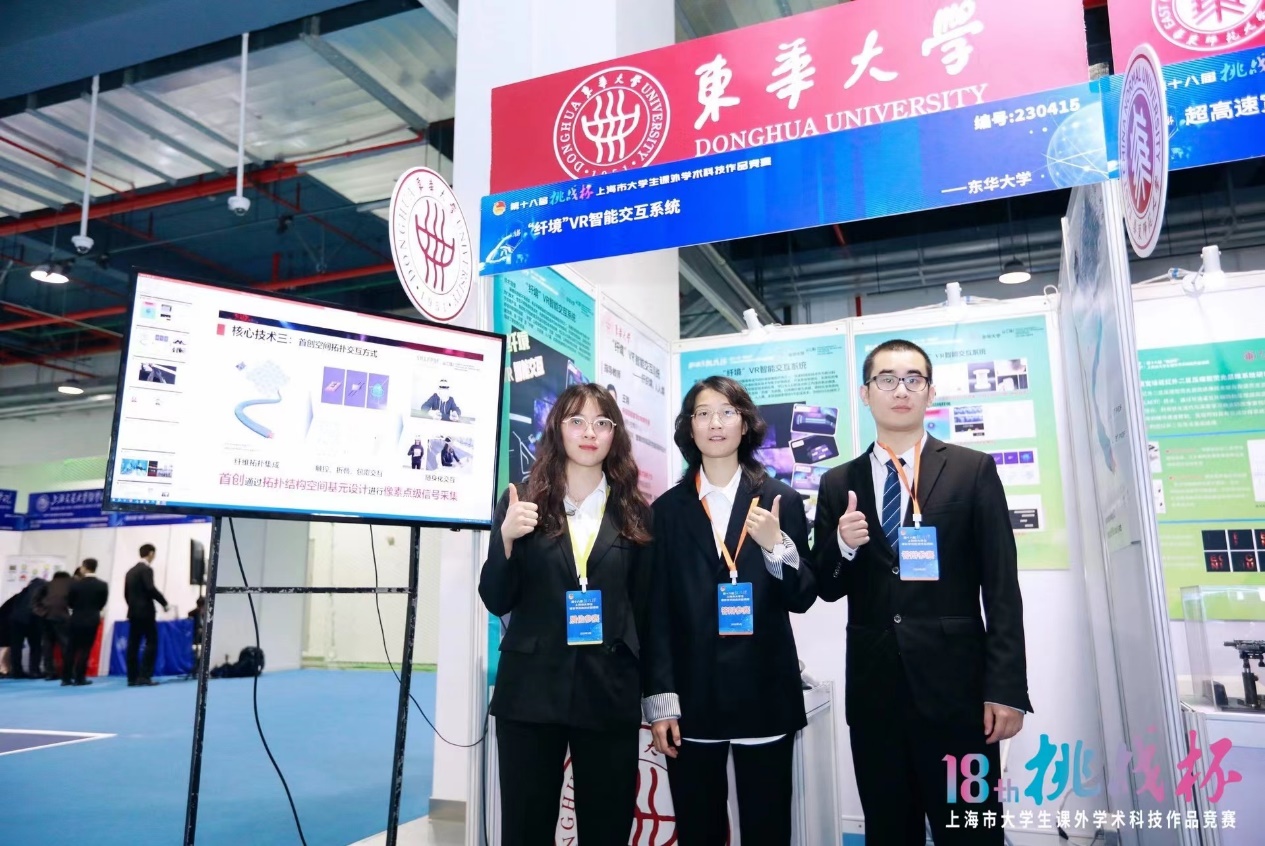 本次我校參賽作品涉及機械與控制、信息技術、生命科學、能源化工、哲學社會科學等類別,參賽選手們以扎實的研究、激烈的問辯、精彩的答辯展現了東華學子的青春風采。其中,材料科學與工程學院《“纖境”VR智能交互系統》、機械工程學院《從“織造”到“智造”——移動式自動掛紗機器人》、服裝與藝術設計學院《“4+1”非遺創新傳承模型構建地方非遺文化庫——以海寧皮影戲為例》等三個項目榮獲一等獎。